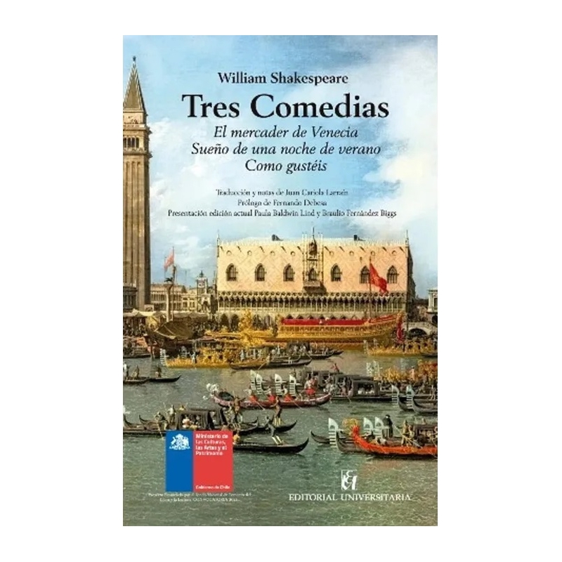 Estas Tres comedias de Shakespeare figuran entre las más notables creaciones de este genio del teatro universal. El mercader de Venecia combina la estructura del enredo con la hondura moral y emocional de una tragedia: la justicia, la misericordia y el poder del dinero se enfrentan en un conflicto de intenso dramatismo. Sueño de una noche de verano ofrece un mundo encantado en el que el amor y la confusión se entrelazan bajo la acción de duendes y hadas, seres que, con su humor travieso y su magia, transforman la realidad en una fiesta de ilusiones, equívocos y risas. En Como gustéis, se plantea la oposición entre la vida cortesana y el mundo natural. La rigidez política y moral de la ciudad impulsa a los personajes desterrados a buscar refugio en el bosque de Arden, un espacio de paz y armonía. Allí florecen el ingenio, la ironía y los juegos amorosos que revelan la profundidad del espíritu humano. El prólogo del connotado dramaturgo nacional Fernando Debesa enriquece esta edición al ofrecer un lúcido análisis del contexto y la trama de las tres piezas. Por su parte, la presentación de Paula Baldwin Lind y Braulio Fernández Biggs aporta una breve biografía de Juan Cariola Larraín –traductor chileno de estas tres comedias–, así como una reflexión esclarecedora sobre el género cómico en la obra shakespeariana. Esta traducción es fiel, íntegra y magníficamente realizada. Su publicación constituye un valioso aporte para los lectores de Shakespeare, investigadores, docentes, dramaturgos y todos